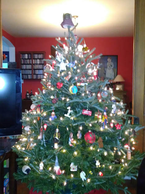 It was a nice day, but it didn’t feel like Thanksgiving. And I was having trouble getting excited about going out on the weekend to pick out a Christmas tree. But we did. A slightly smaller one than usual because I had to wrangle it by myself on and off the car, into the house, and into a tree stand—Ed being but two weeks out of hernia surgery. Won’t take all the ornaments, I thought, but I started stringing the lights and decorating it. “Heavy” ornaments first, and the ones from my childhood—the glass dog, missing a leg and its snout, taking pride of place because nothing, nothing, has been with me longer. Then the “fragiles.” And last, the “regulars.” True, it didn’t take all the ornaments, but I managed more than I’d expected. Gazing at the lit tree in the evening dark, it’s ornaments sparkling, I felt a breath of holiday pass over me. Maybe, maybe… I could do Christmas.