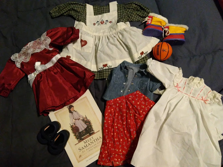 Anyway, I was steaming along full speed ahead. Filling up boxes of books to donate to Reader to Reader. Loading cartons of clothing, CDs, kitchenware duplicates, and kids’ board games for the Salvy Army. Wrangling cords, computer monitors, and other outdated digital hoo-ha to drop off at Staples. When. Suddenly. I was confronted by five LARGE plastic tubs of American Girl dolls, their clothes, their accessories, their little bio books, their stilts and basketball hoops. I mean, these dolls come with a complete world of their own. They also cost, collectively, about a jillion dollars, so I was hoping to get a few bucks return on my initial investment. Something to sustain me in those twilight years ahead.