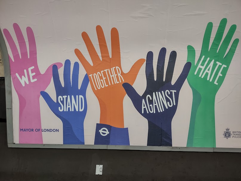 Riding London’s Underground, one is confronted by a host of posters—what’s on in theatres and the cinemas, ads for products and shops, service notices about healthcare, safety. Travel come-ons. My favorite was a large bright notice pasted on the tunnel wall across from the platform at Tottenham Court Road (and likely in numerous other stations). A rainbow of hands is marked with the words: WE STAND TOGETHER AGAINST HATE. To the right of this, the copy runs:
