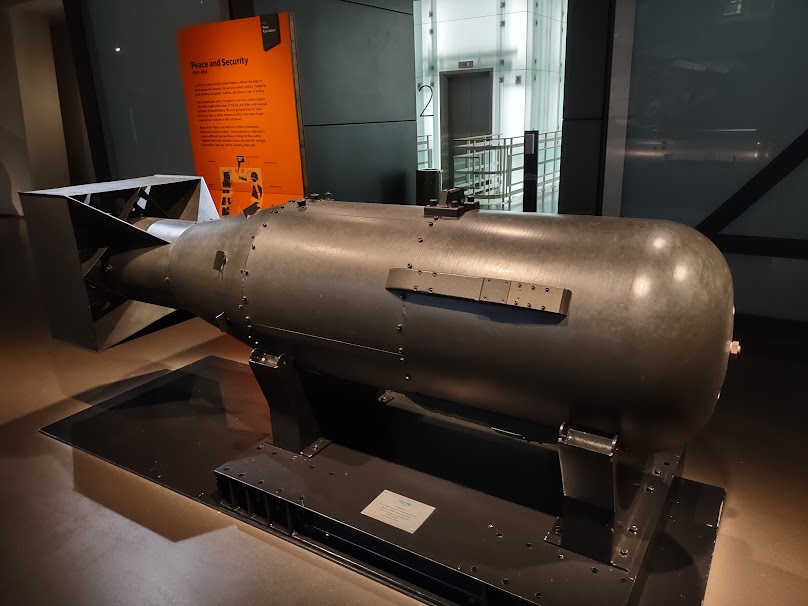 From a display at the Imperial War Museum of casings made for the “Little Boy” atomic bomb that devastated Hiroshima, Japan on August 6, 1945, killing 70,000 people, this note by historian Ian Kikuchi: From the moment the first bomb was dropped, there was no going back. Even now,70 years on, who has the bomb and who does not continues to shape our world.