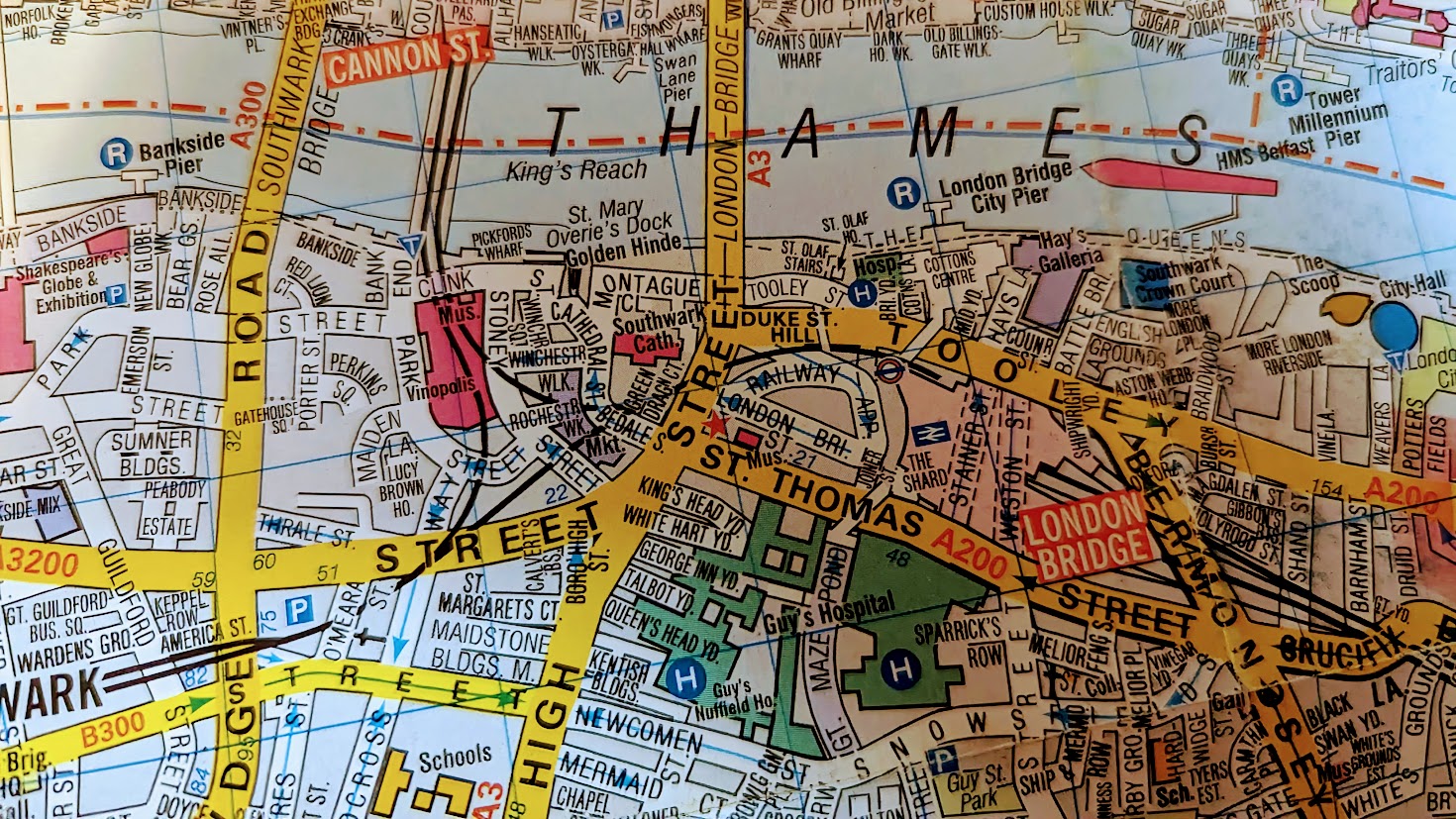 As we drew closer to London Bridge, I continued checking my AtoZ in the near dark—where the hell was Tooley Street? After a few more twists and turns, we came to a wider road with shops and offices on both sides—a throughfare of sorts. I paused at every corner to check the buildings for the street name, something that is usually posted wherever two roads intersect. Five blocks along, I still had not encountered such a sign. During World War II, the Brits had removed the street-name signs in London to confuse the Germans should they invade—well, as a tactic, I can vouch for its success.