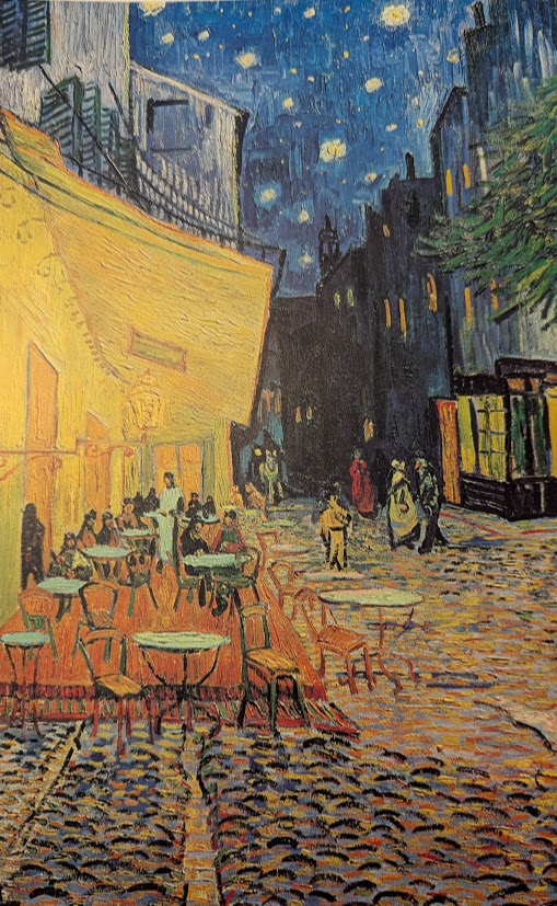 Fully present in the moment. Being where you are. When did we lose that? The question first arose for me at The National Gallery in the year after The Plague. The “natural” flow of art galleries up until then tended to be two or three people pausing before a painting, reading the posted info card about the painter/the subject/whether it was on loan or part of the gallery’s permanent collection, then taking some time to LOOK at the actual work. To consider the painting’s perspective and the artist’s technique—the colors, textures, shapes—the emotional impact of the whole. If the connection was powerful and the number of people waiting to view the painting not too pressing, one might linger a little longer, relish the brilliant golden light inviting us to take a seat beneath the twinkling stars in Van Gogh’s Café Terrace at Night.